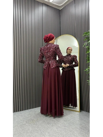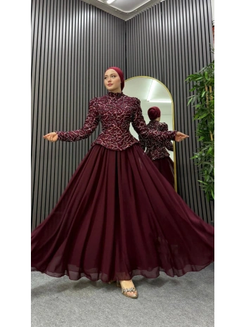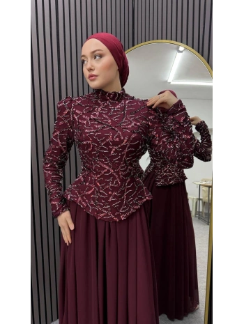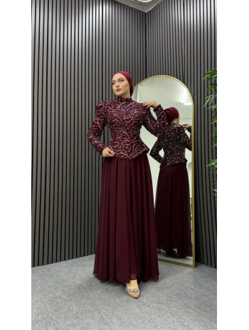 Yeni Sezon Mürdüm Saten Kumaş Taşlı Abiye Modelimiz
