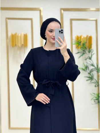 Siyah Petek Krep Kumaş Belden Bağlamalı Fermuarlı Kolları Taş Detaylı Ferace Modelimiz