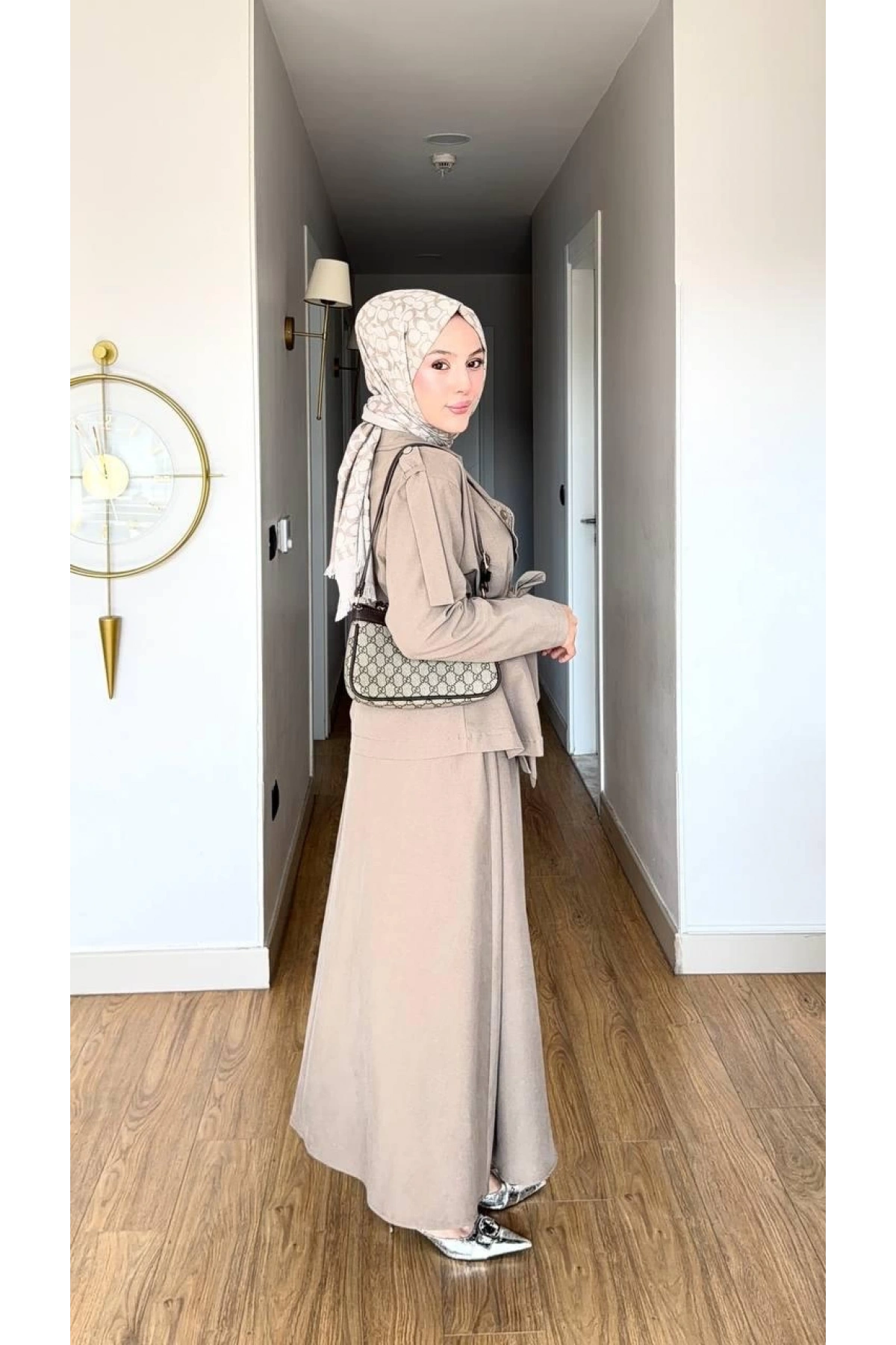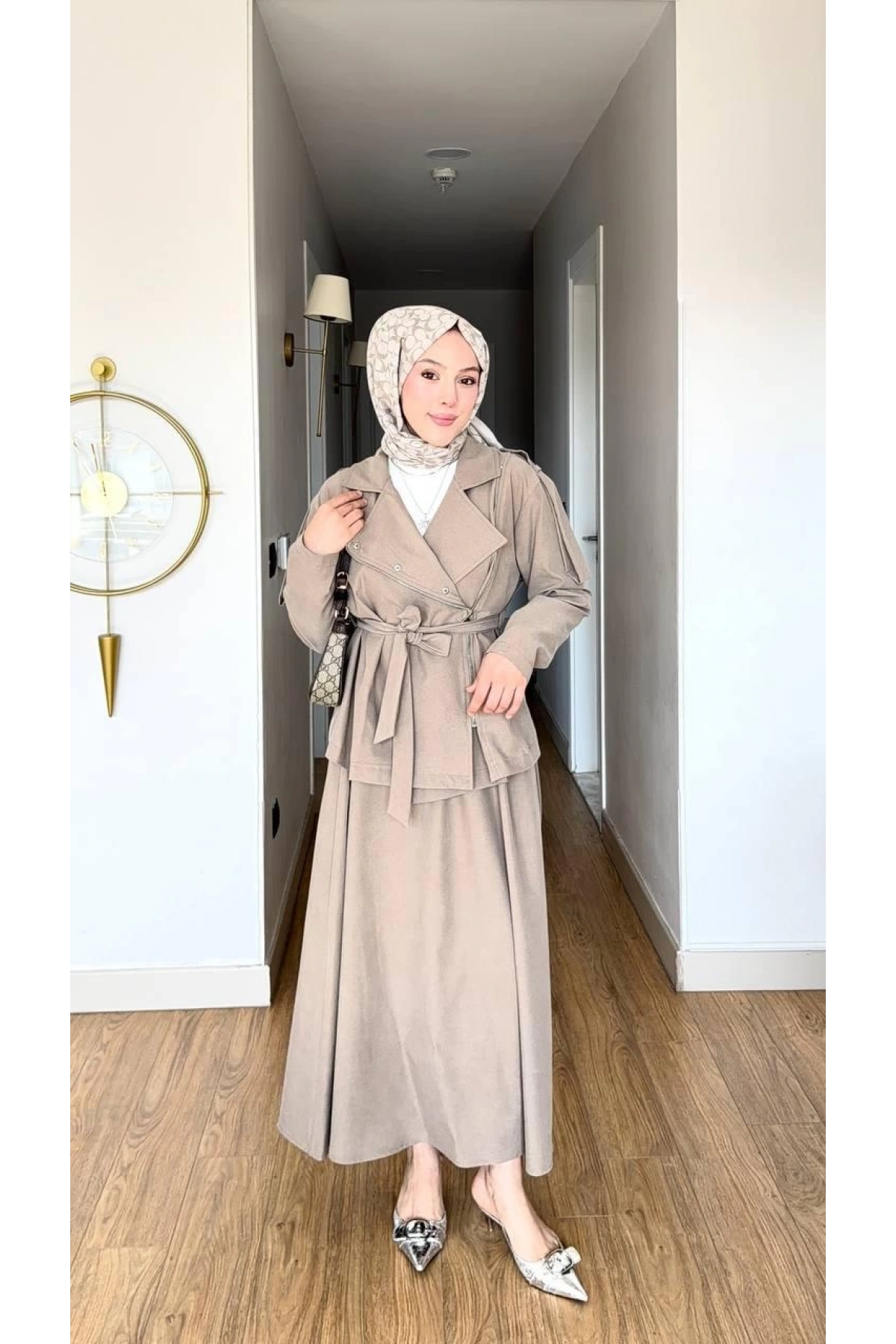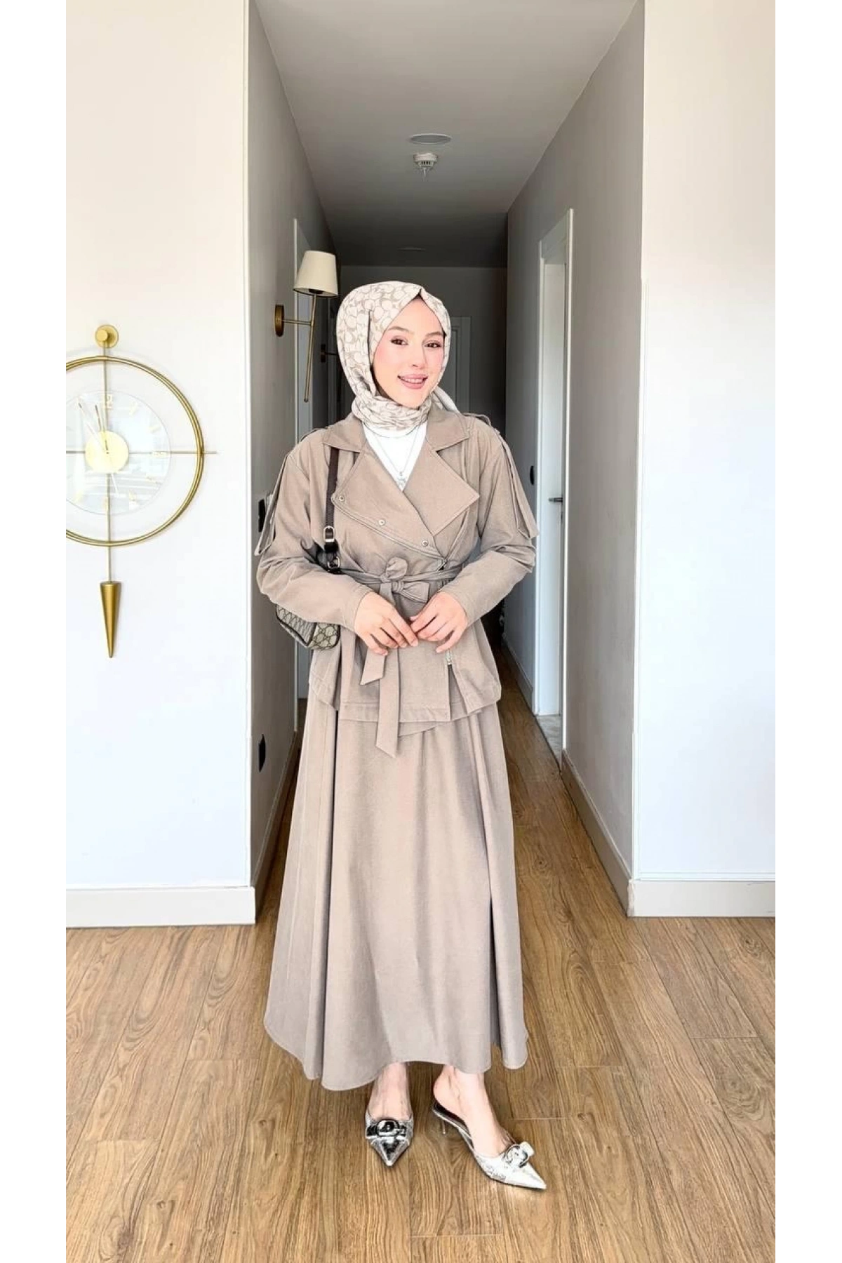 Zarif, modern ve son derece kullanışlı bu bej kuşaklı tesettür takım, günlük ve özel gün kombinlerinde şıklığı ön planda tutan kadınlar için ideal bir seçimdir. Takım; şık detaylara sahip ceket ve rahat kalıplı uzun etekten oluşur. Ceketin kuşaklı tasarımı bedeni zarifçe kavrayarak feminen bir silüet oluşturur.