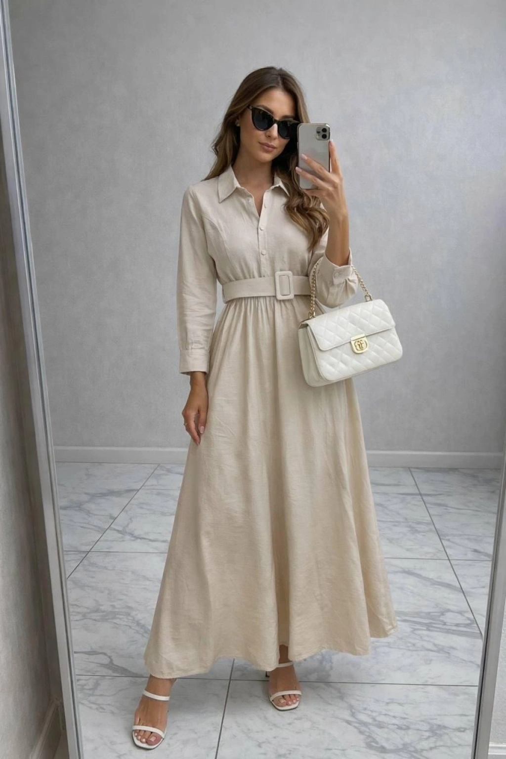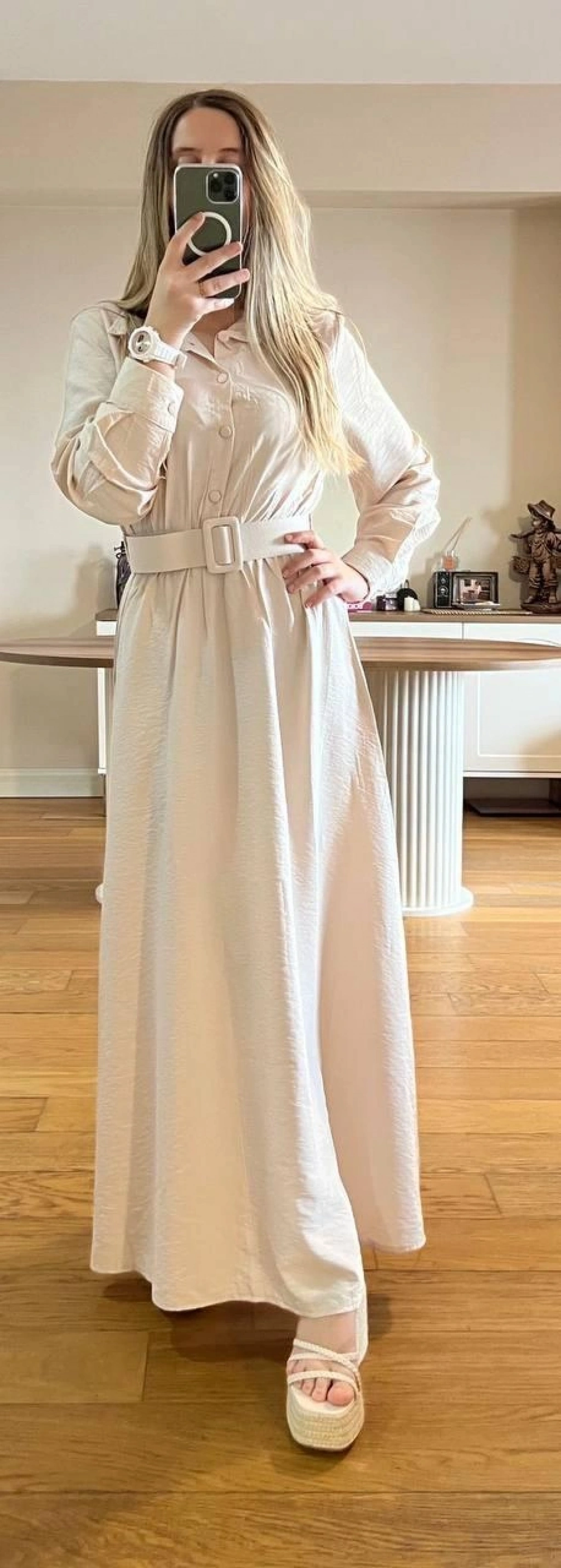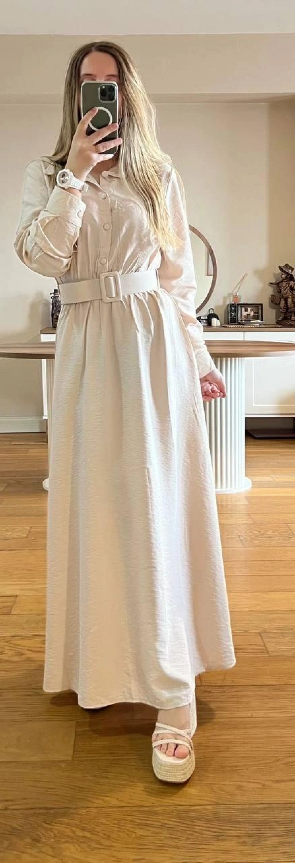 Bej Modal Kumaş Beli Lastikli Kemerli Elbise Modelimiz