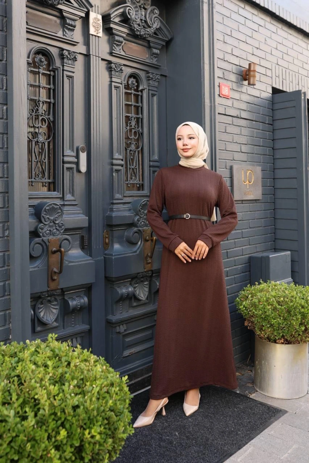 Kahve Rengi Burgu Örme Kumaş Elbise Modelimiz