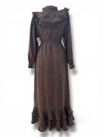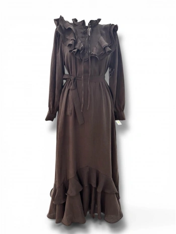 Acı Kahve Modal Kumaş Yaka Göğüs Ve Eteği Fırfırlı Elbise Modelimiz