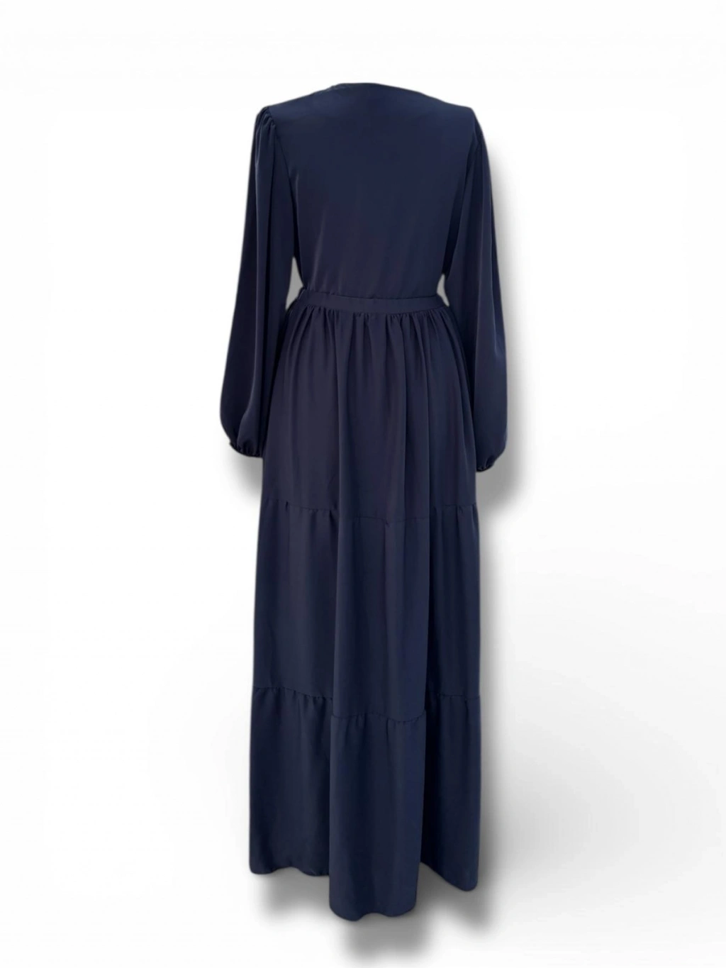Lacivert Belden Bağlamalı İnce Saten Kumaş Elbise Modelimiz