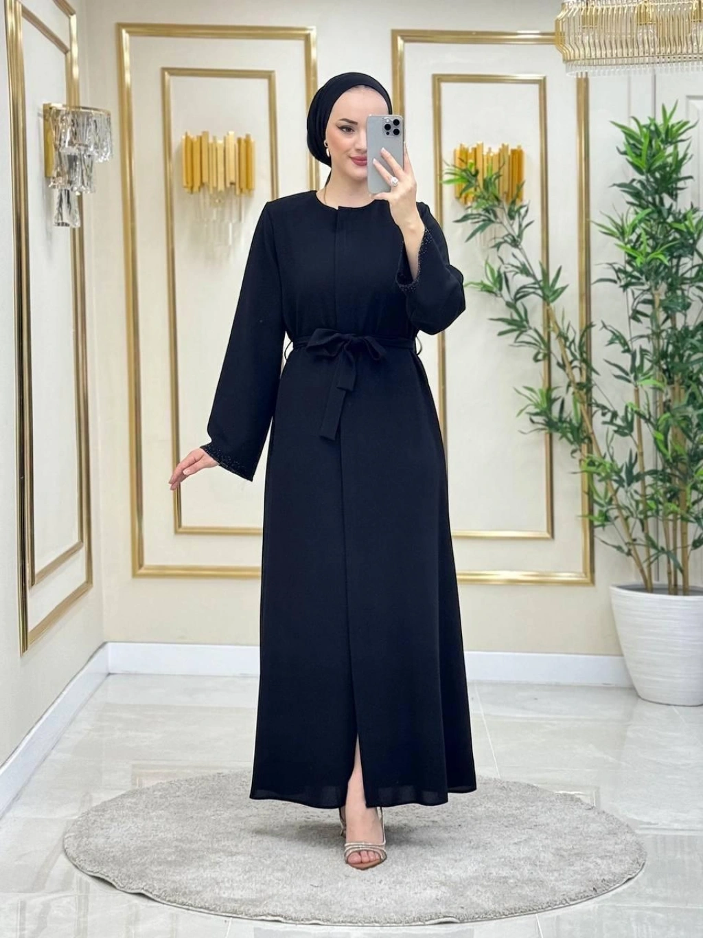 Siyah Petek Krep Kumaş Belden Bağlamalı Fermuarlı Kolları Taş Detaylı Ferace Modelimiz