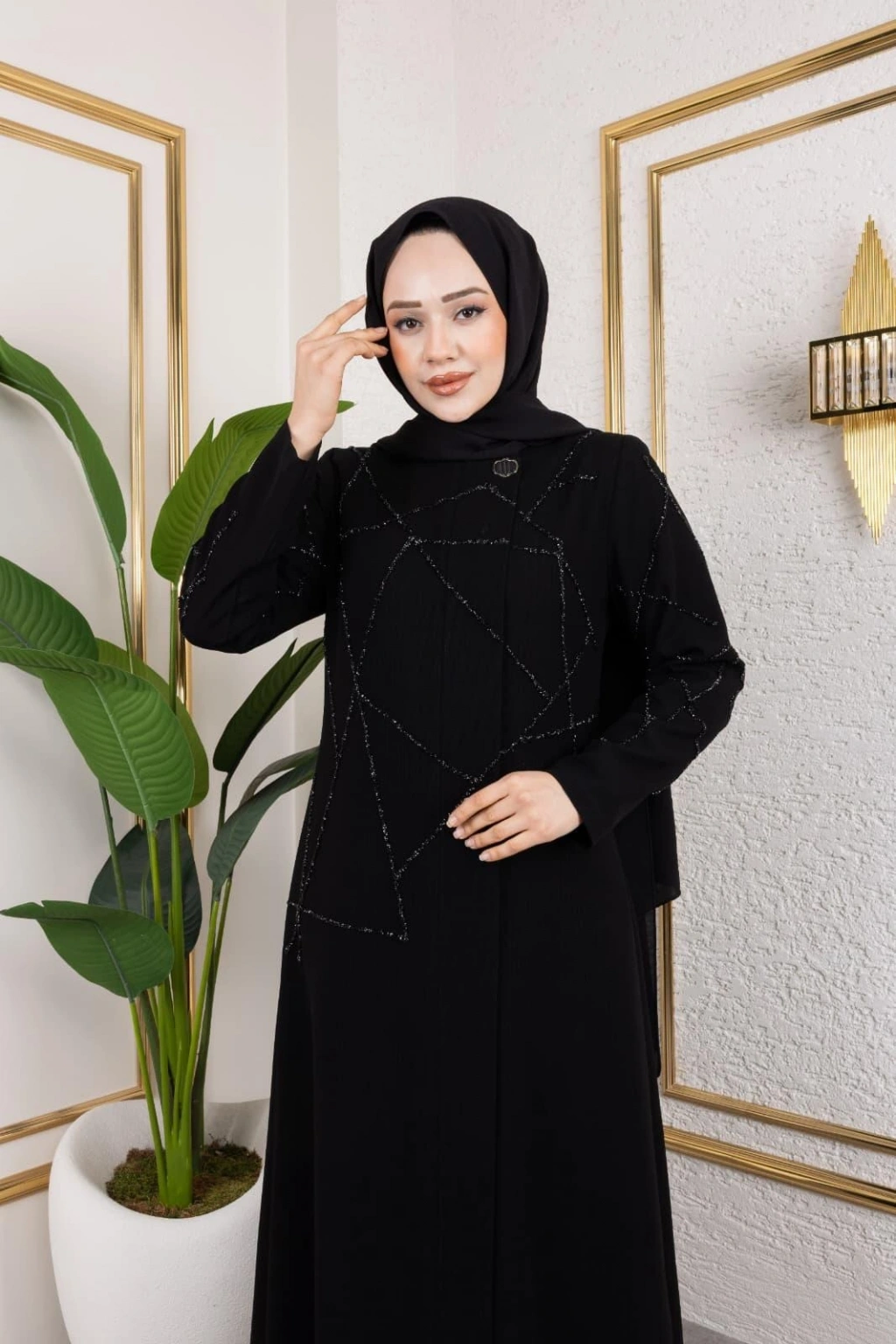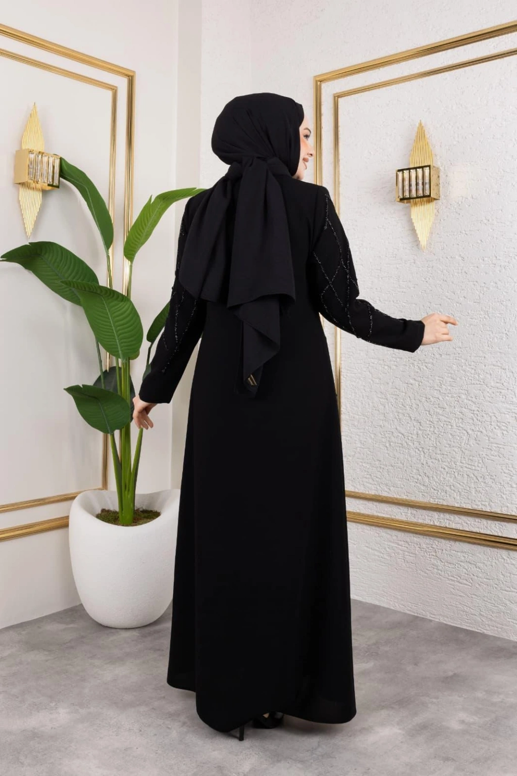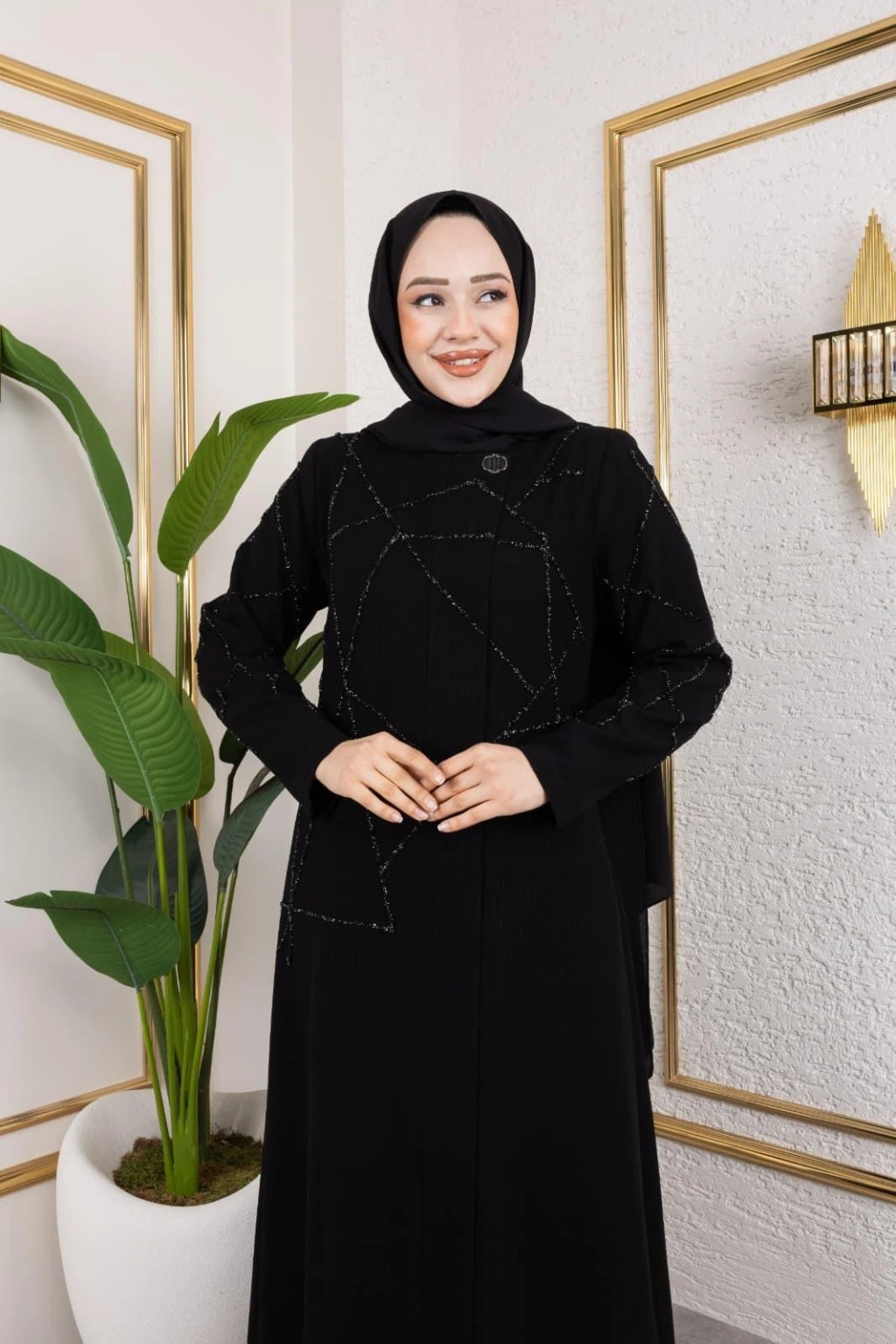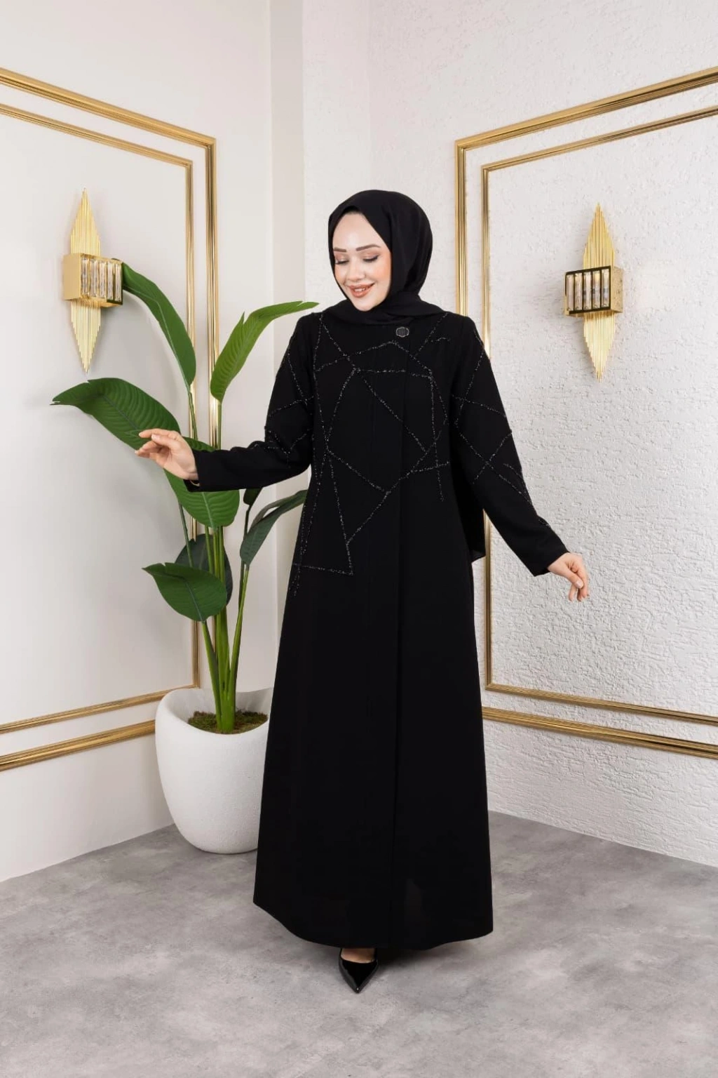 Siyah Petek Krep Kumaş Taş Detaylı Fermuarlı Ferace Modelimiz