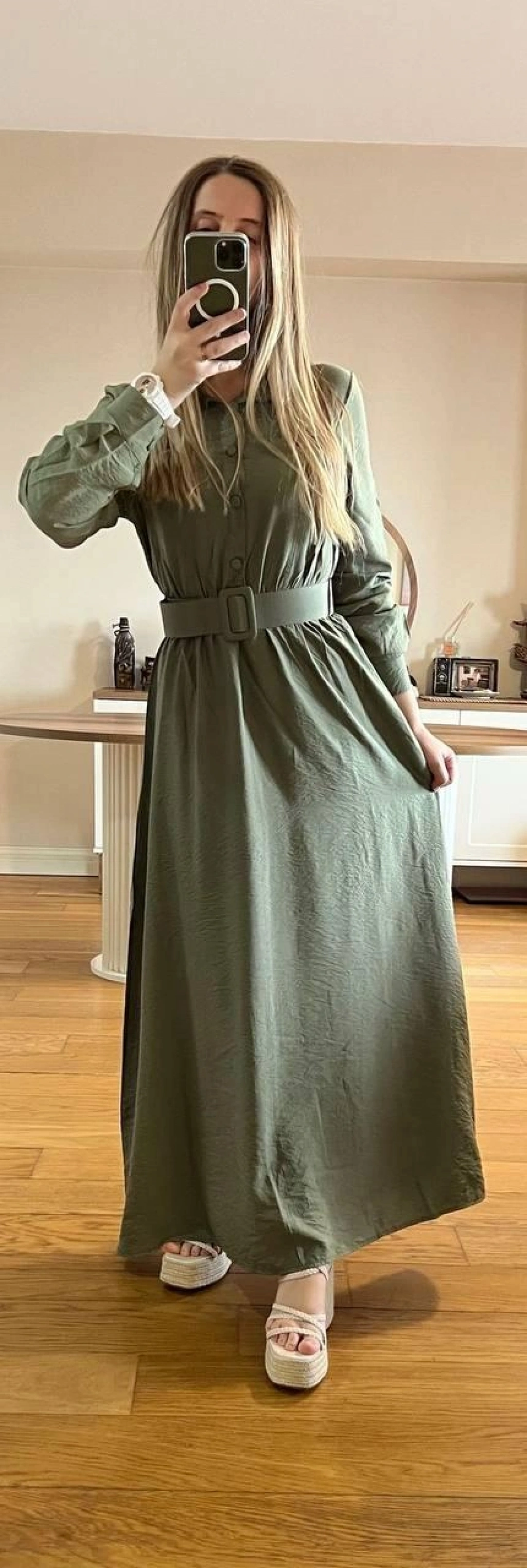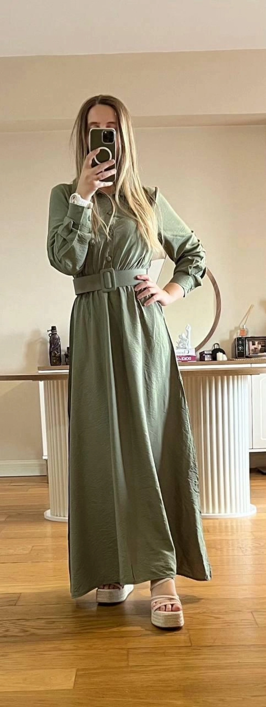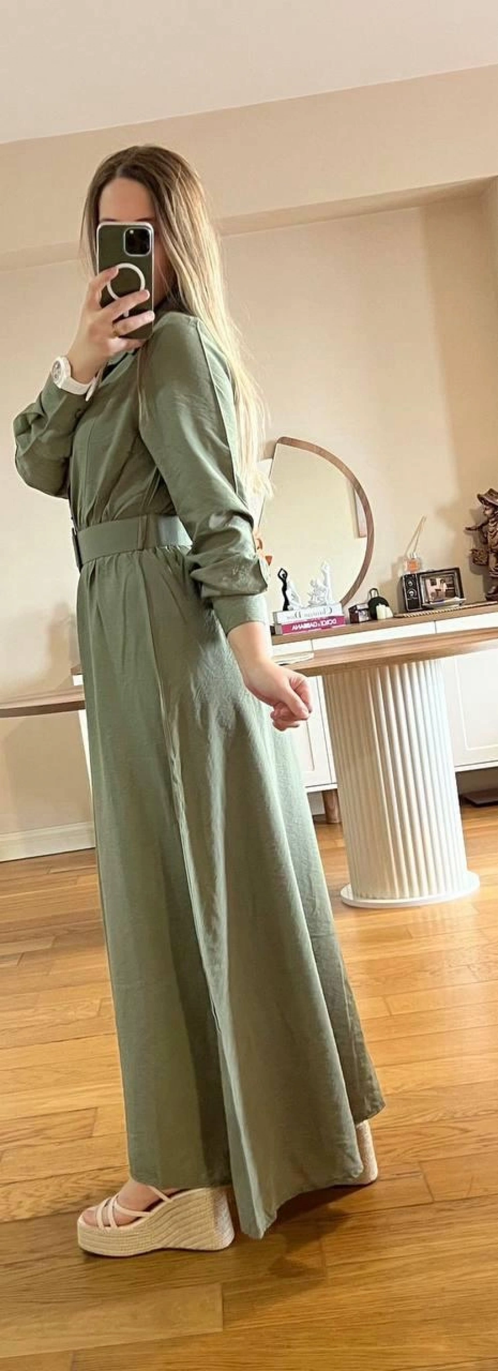 Yeşil Modal Kumaş Beli Lastikli Kemerli Elbise Modelimiz